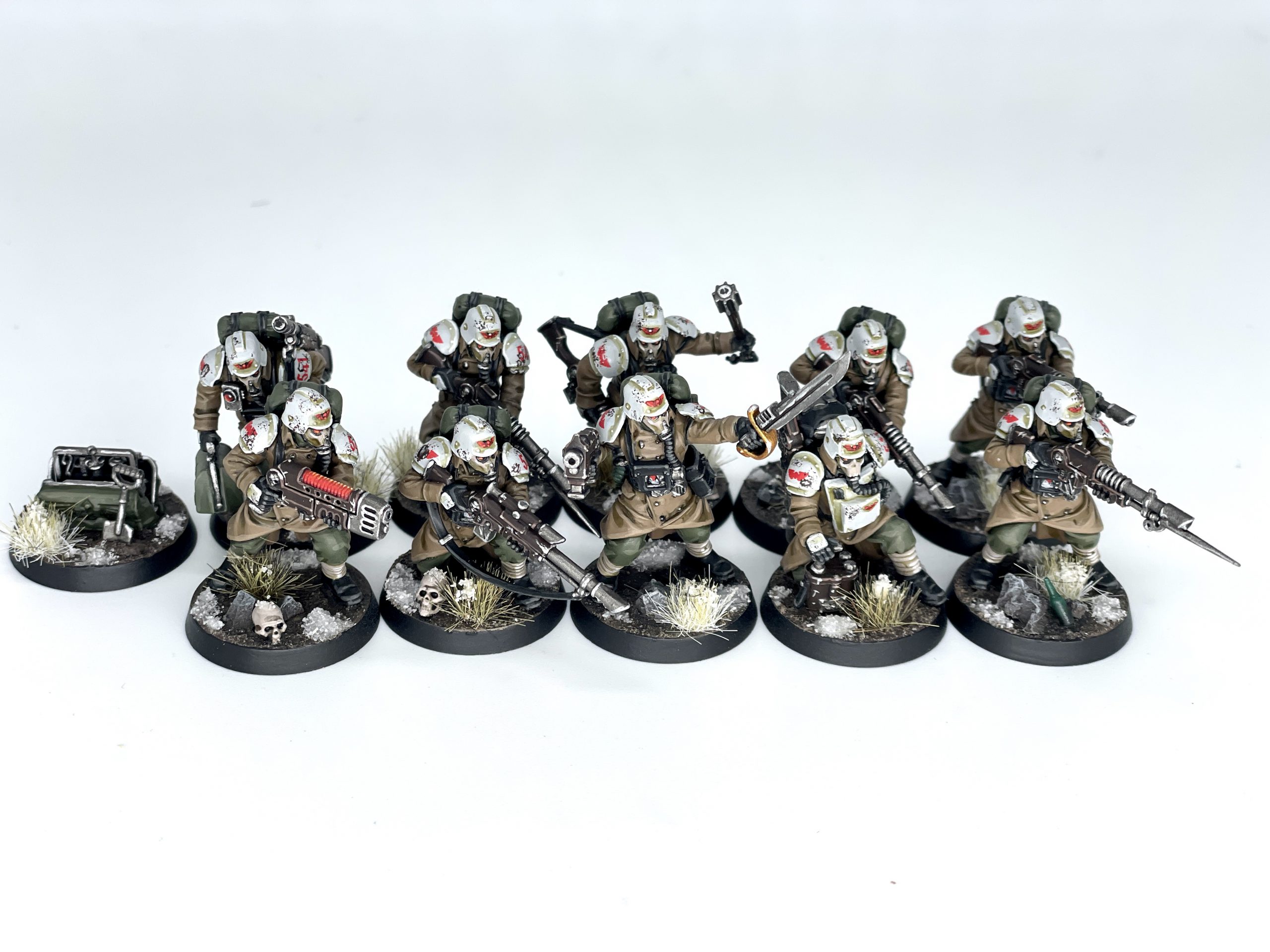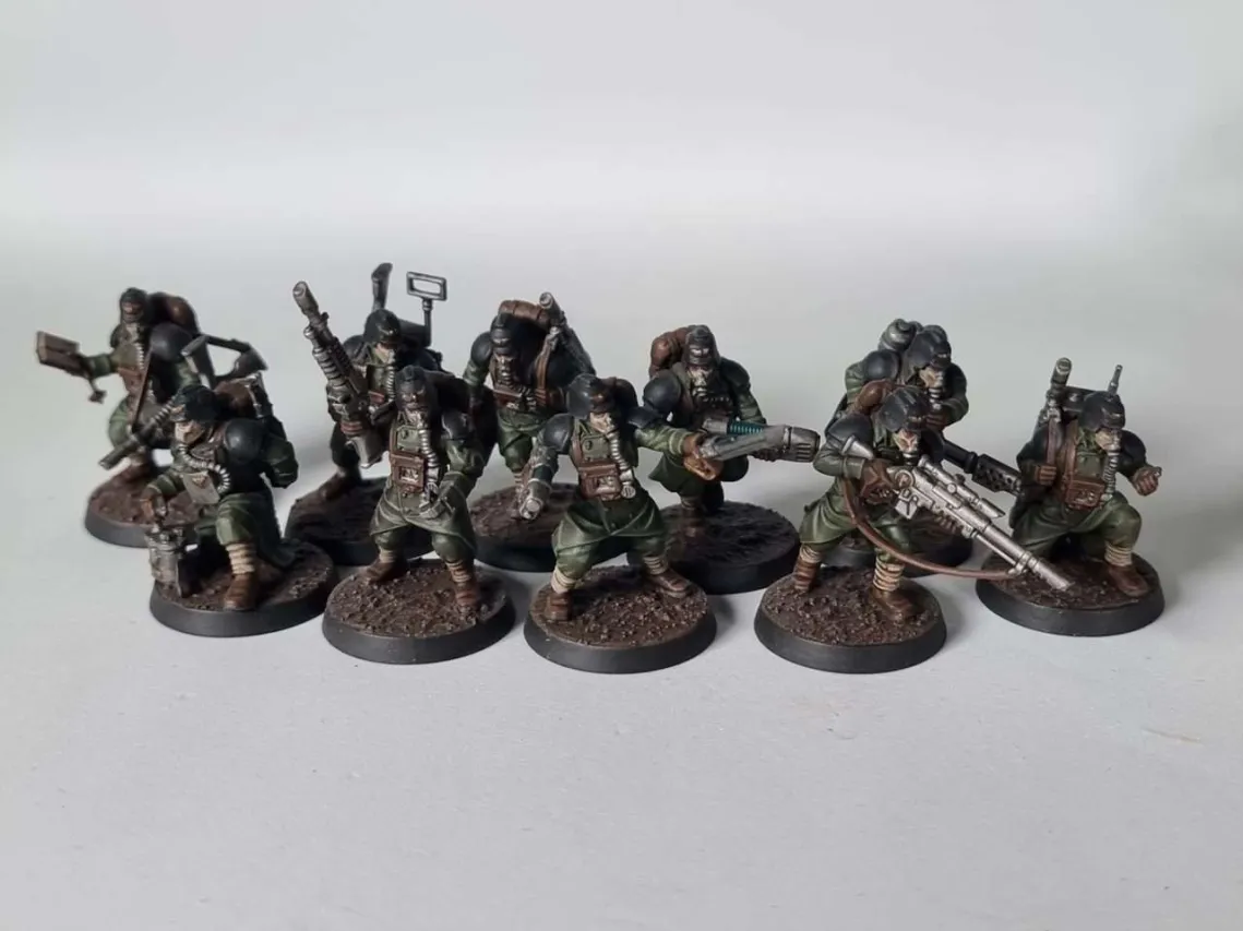 Death Korps of Krieg infantry squad. Credit: SRMNow we come to equipment, which marks some of the most important changes. Chronometer has returned, but now it does what Into the Breach did, BUT BETTER! Once per battle in either the first or second Turning Point, but now all operatives within your territory are eligible. This change combined with Regroup gives you some crazy pre-firefight movement. Hand Axes return as your obligatory teamwide melee upgrade making everyone 3/4 damage. Gas Bombardment and Comm-Beads provide some niche yet interesting options. The former allows a once per game 3 inch marker that reduces the APL of anyone in it by 1. This is a really interesting zoning mechanic, and something that will likely be very powerful in the hands of good players. Comm-Beads simply allow for a Watchmaster or Confidant to give orders to any single operative in the place of all operatives within 6, for when you REALLY need that extra inch.