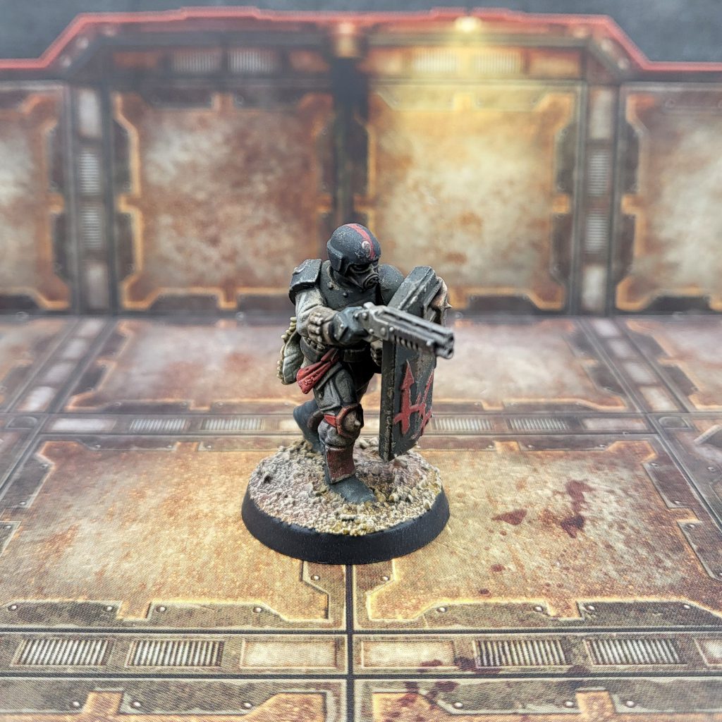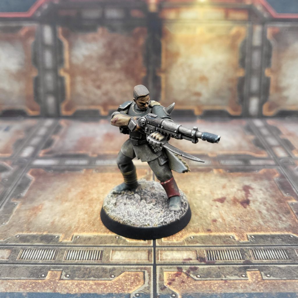A dude with a club…that is deadlier than a boltgun. Our third melee specialist has turned in his lasgun for a big stick that has a 4/4 profile and the Brutal Trait. His only special rule is the Tough skill, which reduces all incoming attack damage by 1 to a minimum of 1. In effect this means this guy can take 1 or 2 more hits from a boltgun and make non-critical lasgun hits almost trivial. Thanks to the Brutal trait he can easily force through damage, and against other trooper/guardsman equivalent operatives he has little to fear in close combat. Basically, this guy lives up to his name, meant to bully non-specialists while not taking any significant damage in return.