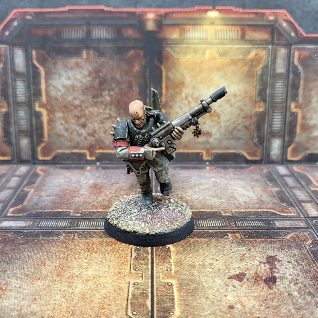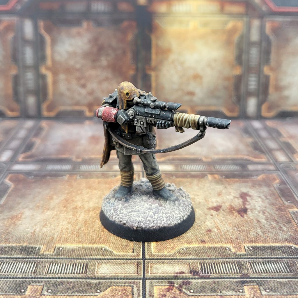 Another surprisingly straightforward specialist, his long-las hits slightly better than your standard trooper along with a flat 3 dmg regardless of a normal or critical hit and a single mortal wound on a critical hit. This weapon has the expected Silent trait that is typical of sniper characters, but critically lacks the Heavy trait allowing him to remain mobile. His only other piece of wargear is a camo-cloak that allows him to retain a second automatic save if he is in cover. The lack of abilities on this operative and the above gunner really drives home the notion that these guys are meant to be in combat, with ranged abilities meant purely as a supporting role.