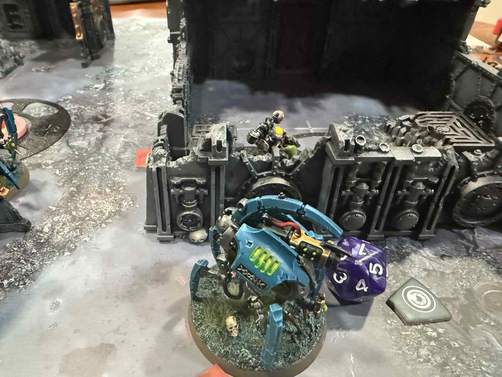 Credit: NBCAiden’s placed one of his Macrocyte Warriors up a little too far to be on his own Matrix, and it leaves him open to a long charge from my Skinthief that he forgot was hidden behind the stronghold. If Aiden had used Cryptogravic Repulsion, I wouldn’t have even been able to make the charge, but since he wasn’t thinking about it he didn’t think he needed to use it. I charge in with the Skinthief, take out the warrior, put my Grisly Trophy on the Skinthief to make him even tankier, and then use Proclivity for Murder to charge into his Canoptek Crawler with the Transdimensional Isolator. I fight the Crawler for good measure and even manage to take it below half. With his next activation, he tries to fall back with the crawler, but since I took chain snares all I need is a lucky 4+ to keep him stuck in combat.