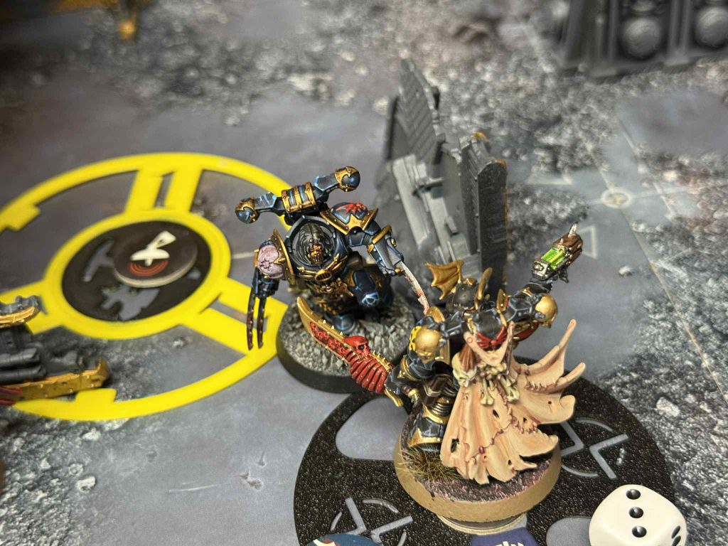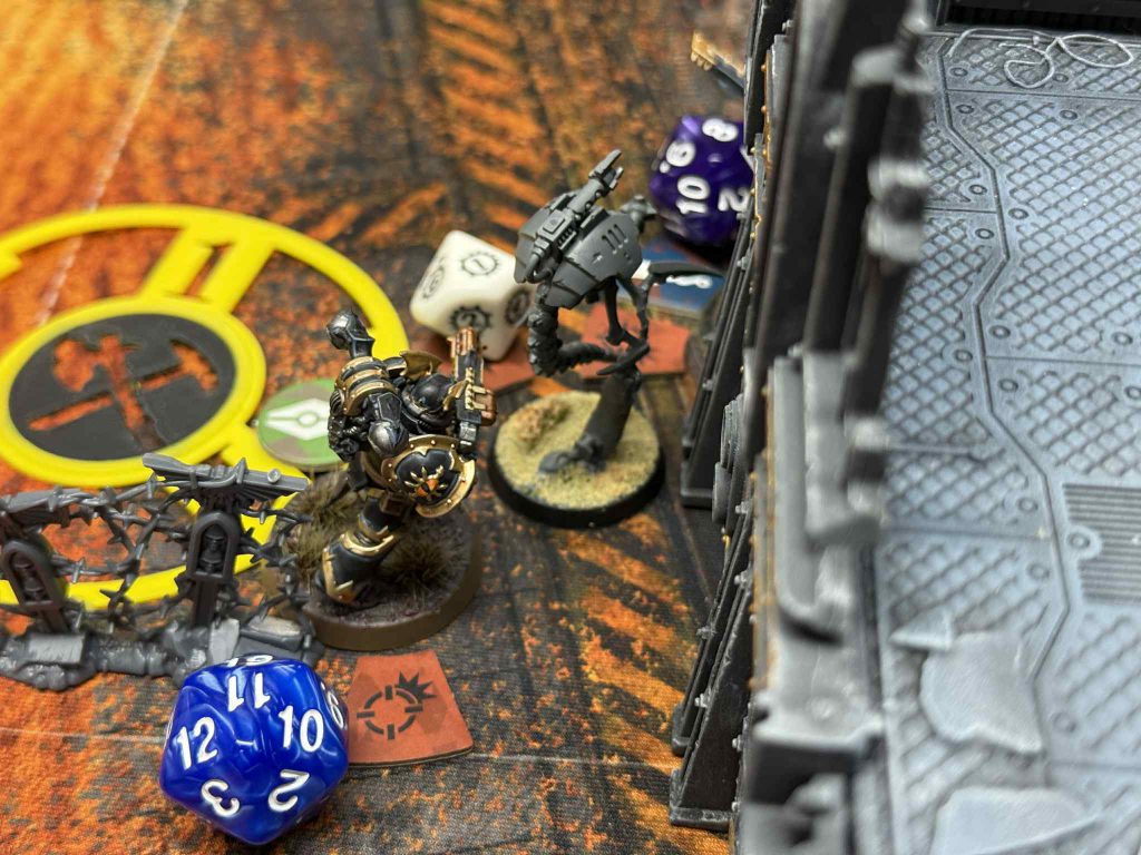 Turning point two comes around and I’m going second, which I’m okay with. That means I can select the first power surge, which is in the middle where I have an operative just barely toeing on the objective. This does mean Eric gets to start initiating the combats, and he send his Shrieker right into my Champion. Thanks to no rerolls from my own nearby Shrieker and prescience, I survive the attacks, but it’s real close. That starts an unfortunate pattern for Eric this turning point- he makes big plays with his operatives only for me to just barely survive by the skin of my teeth. He does finally get a kill with his Heavy Gunner to earn Champion points, but not before I score 2 on the Crit Op and keep him off it completely, score Champion myself, and take out two of his operatives.