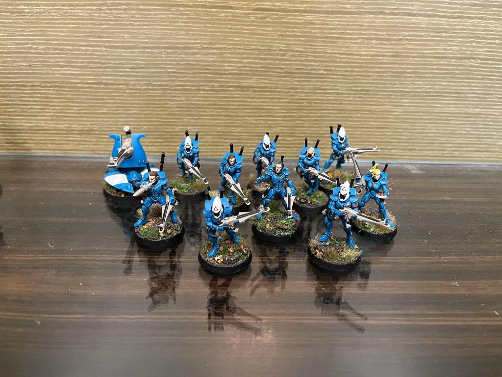 First of the fire teams, and a set of six. They sport shuriken cannons, rending guns akin to bolters, with 4 attacks on a 3+, damage ¾ (a common profile across the team). With 4+ saves and 8 wounds, they can trade shots reasonably well. While they have access to the Weapon Platform and Gunner, the pair are one of the worst uses of rosters slots currently in the game. If you take this fire team, I’d expect you are always taking warriors and ignoring the gunner.