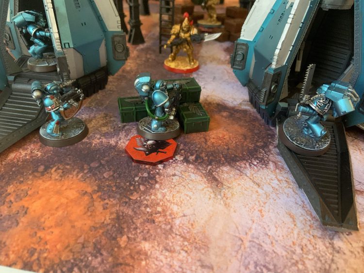 Angry Golden Man prepares to charge a Space Marine Gunner - Credit: Shane WattsEver lose the initative roll when your opponent had a punchy model ready to crash into your line? Decisive Move is here for you! How does this work? Well after you declare that you'll be using the Tactic, your opponent can either try and counter with their own or let it go. Ideally they'll want to use their CP for something else later and they let it go. At this point, your best move is to pick your least valuable model near said enemy punchy model, and charge it right into the punchy model. "But Shane," you ask, "Won't this model more than likely die?" Yes, but it is preventing the enemy punchy model from getting to your more important models, and doing so more definitively than just moving backward might.
