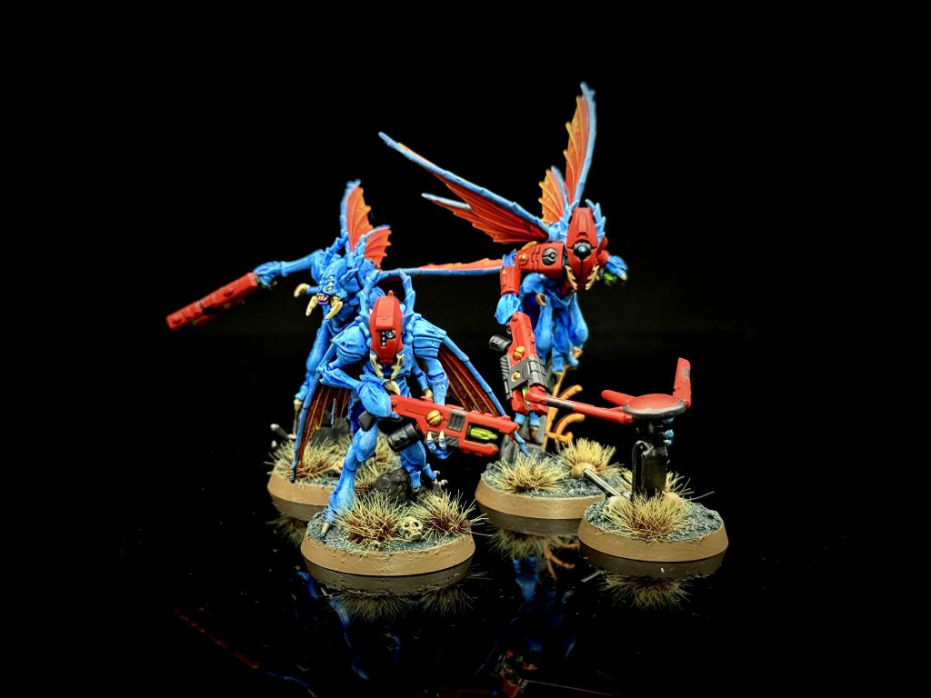 Painting the main body, I used Asurmen Blue contrast over a zenithal prime, followed by drybrushing Two Thin Coats Gigawatt Blue. It’s a little messier than if I painted it traditionally, but way, way faster, which is the goal here. For the wings, I used a trick I’d done before with some Tyranids I’ve painted and applied a coat of Doomfire Magenta contrast paint, then a drybrush of increasingly bright yellows and touching it up with a very thinned down coat of Doomfire Magenta again. This is super easy, and really makes the miniature stand out.