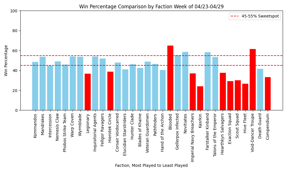 We've also got multiple weeks of data watching now, and no appreciable changes to Fellgor win rate, perhaps its time to give the dreaded goats just one more small tap? While Void-Dancers remain at a reasonably high worldwide win rate, though their play rate has fallen off a cliff. This week was truly a week of feast or famine with a large chunk of the meta cratering in win rate. It seems that the days of Navy Breachers dominating has come and gone, with the team struggling week to week.