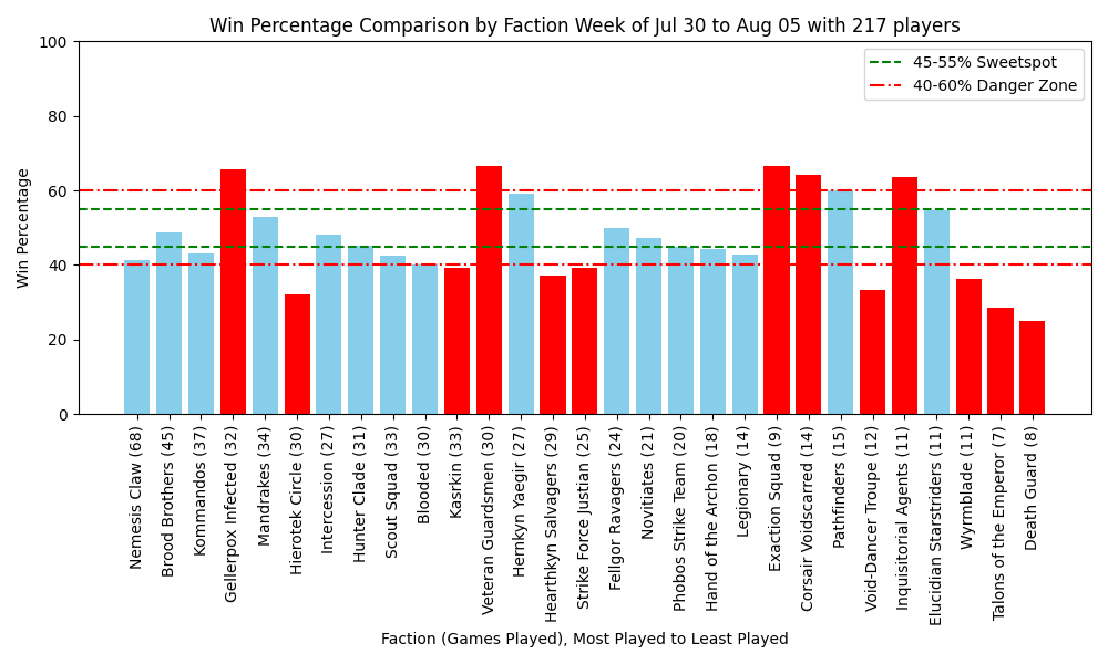 We’ve got a much smaller weekend of competitive play than the last few months, with only 200+ players compared to the traditional 300-400. That does mean our dataset has some more pronounced spikes this week. A few factions that have traditionally suffered in recent weeks have spiked hard, looking at Veteran Guardsmen, Exaction Squad, and Corsair Voidscarred! However as a week without any larger events we can’t really know if these players dodged the bad matchups or other happenings. Another late edition stand out is Gellerpox, showing that the faction can have success outside of the few consistent players.