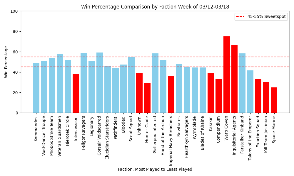 Warp Coven, Inquisition Agents, and Farstalker Kingbands all saw incredible weekly performances, with Warp Coven performing well in Spain, no less. As one of the most competitive Kill Team scenes around, we’ll be attempting to reach out to the players to see if we can bring back their starts at a later date!
