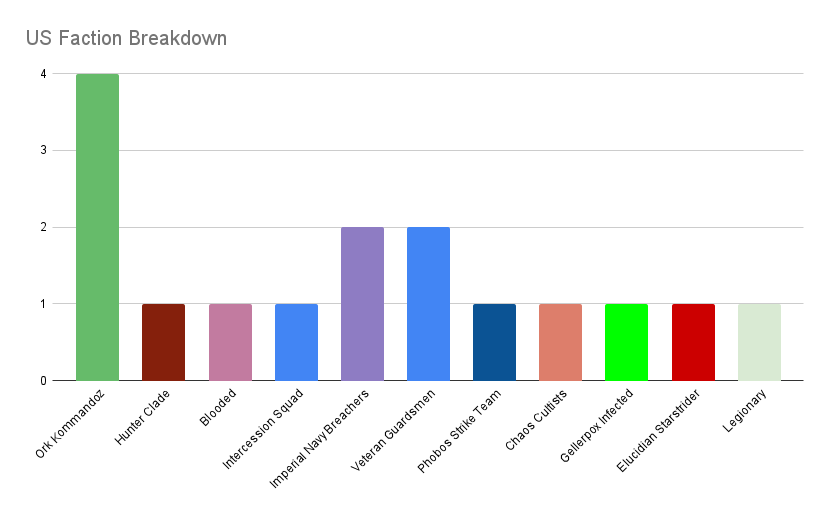Team-wise, the US has a strong contingent of Kommandos players - the only Xenos teams in the mix for the US. It seems Americans aren't too fond of Aeldari and other Xenos this year.