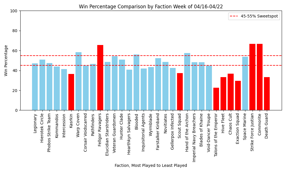 Kt Stats Apr16-22It does seem that if you’re looking to pick up a team with some surprise power the Blooded may be right up your alley. The combination of a wide team, with some heroes and late game ramping damage, means Blooded can stabilize an early advantage. Especially with the release of so many lower operative count teams. We’ll see how the Nightmare releases feel next week, though it is notable that the 3 players on “Commorites” were all Mandrake players who clearly had a good weekend outing.