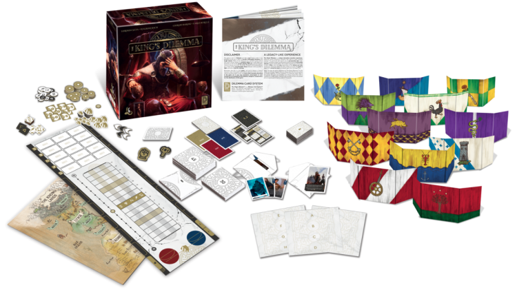 3 voting cards, some tokens, and a screen is all you need to rule a Kingdom. Credit: Horrible GuildKing's Dilemma is a narrative legacy game where players embody Noble Families across centuries of rule. None of these families are the royal family; the titular King is always an NPC. Instead, your player families are more like the Small Council whispering advice into Royal Ears in service of the Kingdom and your own personal goals. This advice takes the form of voting on small narrative decisions. Do you send diplomats or soldiers to the barbarian tribes of the north? Do you fund an expedition of discovery or invest in your kingdom? Do you accept an offered trade of strange food or reject it? Each game represents the major decisions in the reign of a single King; it will end in either the abdication of the throne or the death of the King.