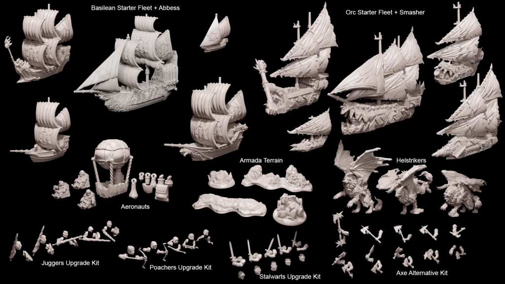 The May Monthly Pack is incredible for any into Kings of War and Armada. On the Armada side, the starter fleets for the Orcs and Basileans, as well as an extra ship each, are included. For Kings of War it’s all about Riftforged Orcs and Halflings. All three sculpts of the formidable Helstrikers are included, as well as a set of axe wielding arms to upgrade the regular Riftforged Orcs legionaries kit. For Halflings, the infamous Aeronauts are available, and upgrade kits for making Juggers, Poachers and Stalwarts!