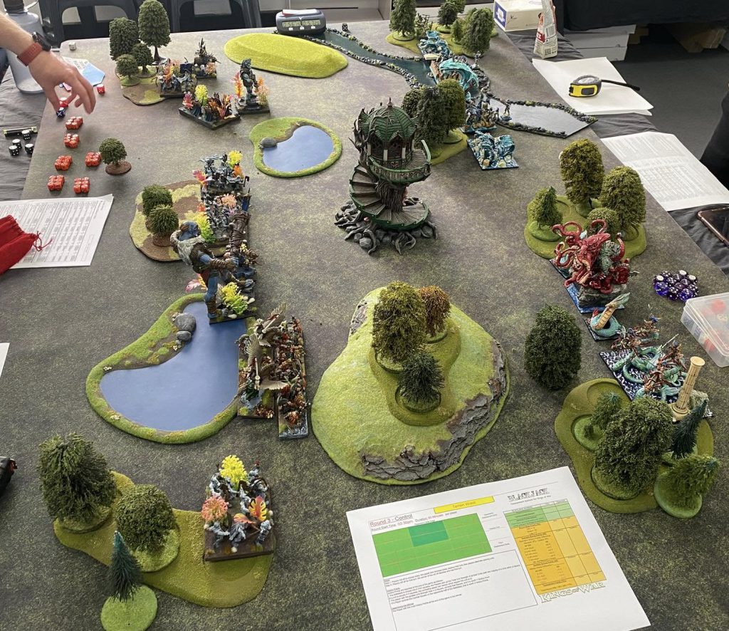 A big battle of Kings of War on a 6x4' table with lots of terrain. Credit: Cytoplasm.