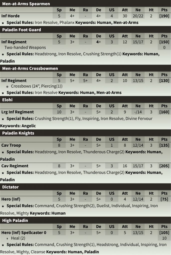 Unfortunately for now there is no Alanis Sallustis to take in the army, but a High Paladin is a good stand in. This unit can fight in combat and do a little healing. The base size that Alanis comes on is bigger than a High Paladin’s, but that’s not a major issue when it comes to this particular unit type.