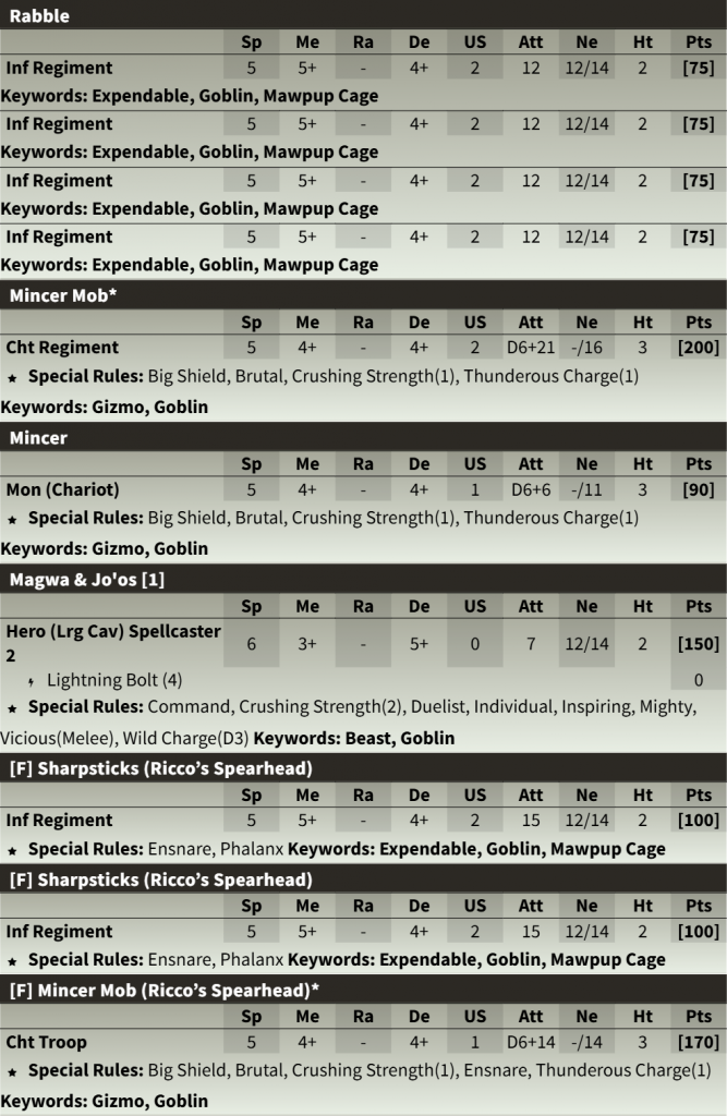 Goblin Ambush set is such a good expansion for Champions, might as well get two (even three?!). Credit: Mantic Games.The Mincers are great units, either alone or packed together into Mincer Mobs. We recommend making a Troop and a Regiment of Mincer Mobs, in addition to the single Mincer from the Company Box. While a Troop of Chariots should have two models and a Regiment three models, the size of these Mincers means that putting just two on a Regiment base along with perhaps some extra Goblins is perfectly acceptable. A Regiment of Mincers is truly something to put fear into the enemy.