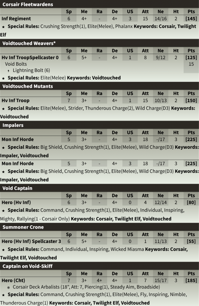 The Void Captain that comes in the Army Box is a useful combat character, but works well with all Keyword: Corsair units thanks to her Rallying (1 - Corsair Only). Keep her next to the Corsair infantry and even the Void-Skiff, and you’ll have a decent battlegroup of deceptive durability.