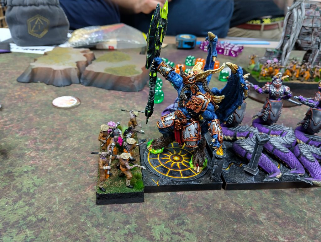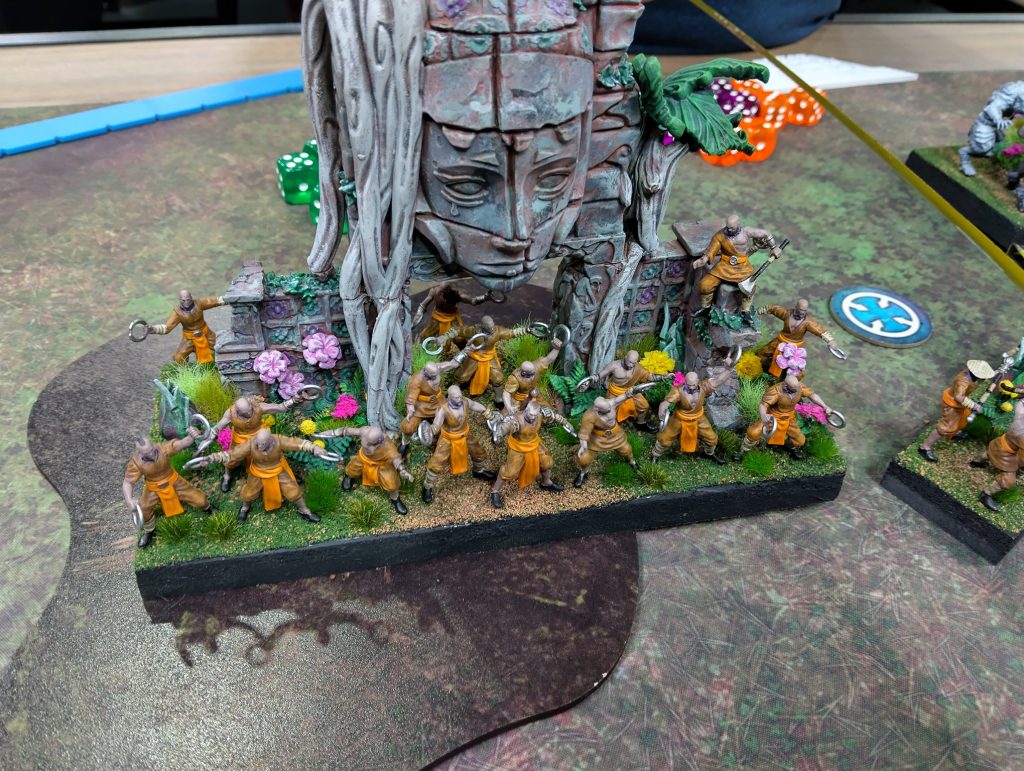 Cytoplasm's Lord of Lies is opposed by Tucky's brave, if doomed, Warrior Monks of Yan. Credit: CytoplasmThe impact of sticky combat is that once units get stuck into combat (hah), they remain there until the bitter end of one of the units. This means other units might enter the fray over the course of the game and a big pile up can ensue, with multiple units hitting flanks. It also means that the tougher units that like to grind can actually share the limelight with faster, harder hitting units, especially now that multicharges into the same facing are limited to just two units. It’s still possible for two units to obliterate an enemy unit in a single charge, but a well placed horde of infantry can stand up to the best now, where before that third unit charging in would spell the end. My horde of Lower Abyssals held their ground and used their Regeneration for three turns, despite being charged in the front and the flank! This enabled other units to come to their rescue and eventually win over that entire side of the battlefield.