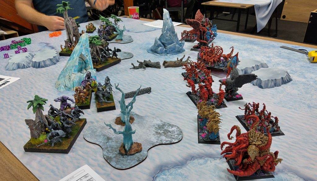 A very exciting addition to Kings of War are the three types of deployments; along the long edges, the short edges or diagonally opposed. These aren’t anything new to rank and flank wargaming, but the fact that these deployments are independent of scenario means that when combined with the twenty different scenarios in the fourth edition rulebook, there’s sixty permutations. In this event, each of the three deployments were used and everyone agreed they were both a lot of fun, and they changed up the game considerably.
