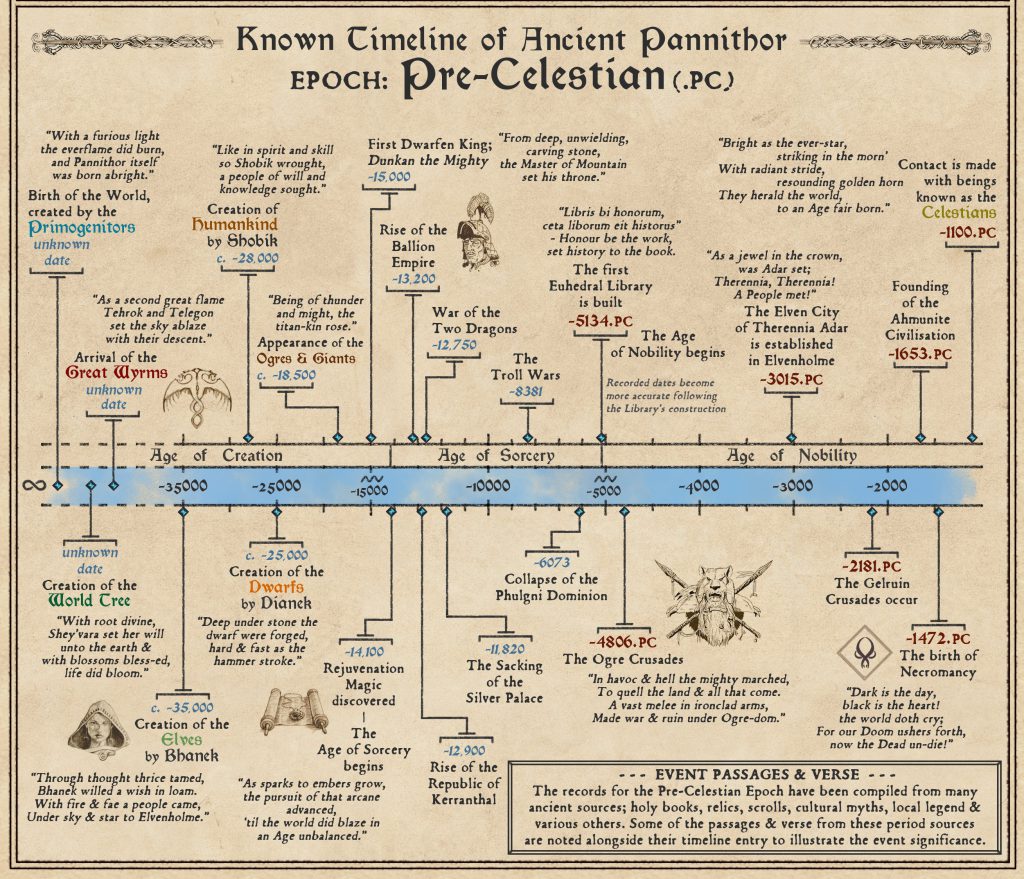 The first formal timeline of events in Pannithor prior to the Celestians. Published in the Kings of War 4th Edition Rulebook. Credit: Mantic GamesTime did not formally begin in Pannithor (at least in terms of chronologically recorded history) until the creation of the first of the three “noble races”. They’re called “noble races” but that seems to be a self-ascribed title. There exist so many more races in Pannithor (Ogres!) that would contend that the “noble races” are far from noble. Moving on.