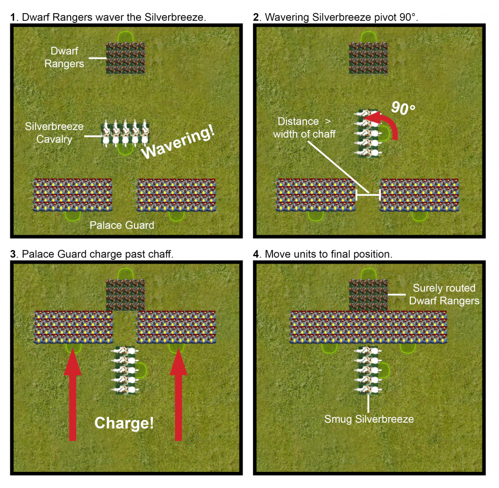 The key to getting the most out of these facts is that two mainline units behind the chaff need to have a gap between them that is at least the same distance as the depth of the chaff unit. This allows the two mainline units to then move straight past the wavered chaff without the need of a pivot.