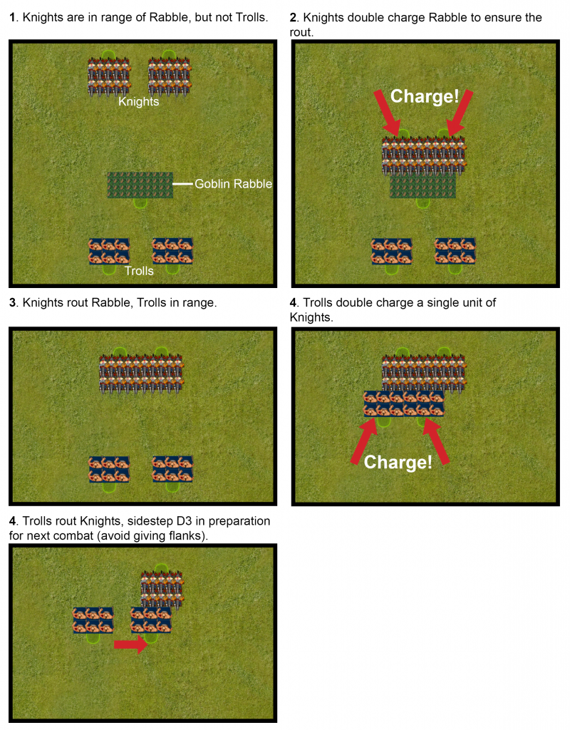 Using cheap hordes as chaff.Upon the demise of the horde chaff, your mainline units need to be ready to strike. This means ensuring they have range on the enemy units even if they move back 3” after the combat. Having multiple mainline units ready to multicharge is even better. The idea is that the opponent’s powerful units have been lured out, and your mainline units have their pick of which to destroy, so make sure it can be done. Otherwise what did those Goblins die for? Did they die for nothing?!