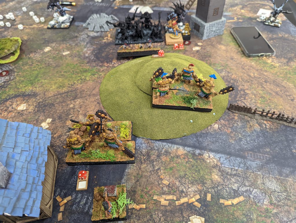 The heroes of the Goblin forces. Left to right: King on Fleabag, Groany Snark, King with Pendant and Grupp Longnail.The Bangstiks on the other side held off the Beserkers, who really really didn’t want to get charged, and kept shuffling backwards. My Troll Bruiser on Turn 2 grabbed one token, and then another, while the Beserkers were forced to be nice. Once that was done, my Bangstiks promptly abandoned that flank and relocated to the main battle, an easy task when Speed 10 and Nimble.