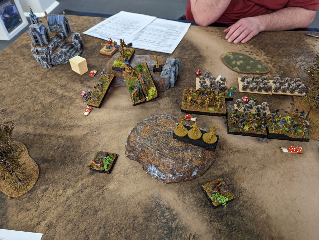 I block the Revenant Horde with Snow Foxes, and charge the Scorched Earth Necromancer with the Flying Lord, and the Vampire with the scorched Fallen, and just wiggle around for positioning with everything else. The Conclaves are applying light damage to the Werewolves and Wights, whatever they can see as they reposition around the hill. Unfortunately in combat I don’t manage to kill or waver the Necromancer or the Vampire, and that makes things a struggle from then on.