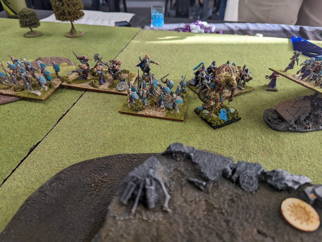 Most of the Dwarf forces created a giant line of Ironclad with Golloch’s Fury, the Scorched Earth Stone Priest and the Dwarf Lord for support. On one flank was the lonely Ironguard (aiming for a token) and on the other side the Beserkers, the Steel Behemoth, the Battle Driller and the remaining Stone Priest (also all aiming for a token).