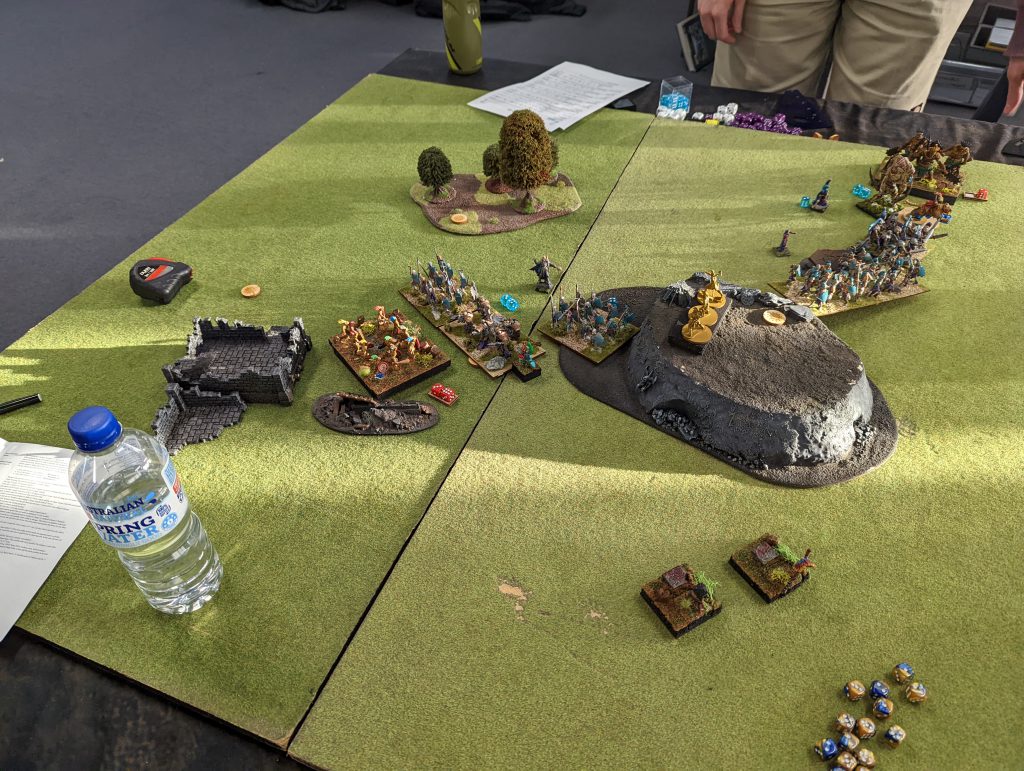 By the end I somehow had both my Rabble hordes deep behind Mitchell’s lines, but a rear charge on some Water Elementals proved too great a temptation. This was stupid. I achieved 3 wounds in total, and the Water Elementals countercharged to remove them. Very stupid.