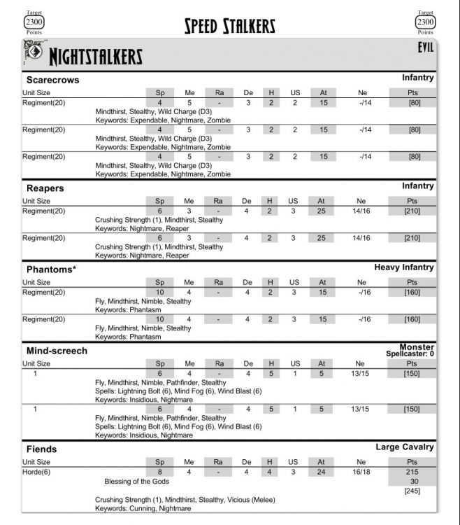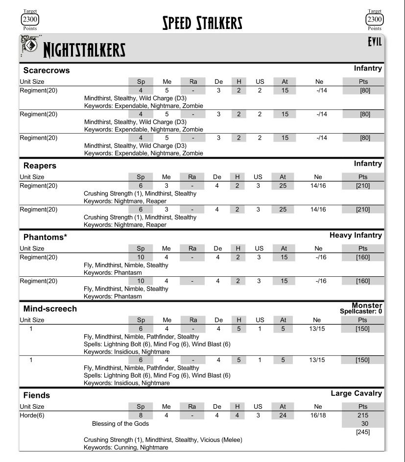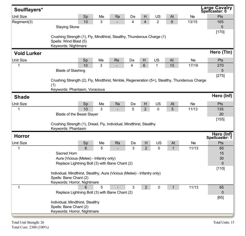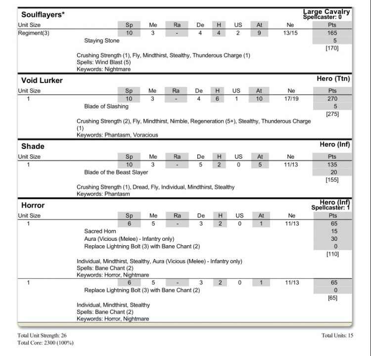 Urr: Overall, I really like how this list has developed. It’s fun to play and hopefully fun to play against, too. I’ve managed to retain the units I like the most and have worked out how to get good use out of them. I’ve also grown to really like the Void Lurker, and gain a better appreciation on how to use fliers, rather than just zooming them up the board to die. I’m still not 100 per cent sold on the Fiends, but I have them painted and ready to go, so that's at least part of the reason they’ve made it into the list. Yet, they might be the first to go come the Clash of Kings update.The list does lack a bit of ranged power. The Mind Screeches are my sole source of shooting, and they tend to get wavered pretty early for me. But the utility they provide is just too good, especially compared to the other ranged choices available to the Nightstalkers. War machines won’t be too much of a problem, although a horde army might be, if they can layer themselves enough to cover their vulnerable points, but I guess we’ll see when the time comes. The real challenge will be to see if I can replicate this playstyle on the tabletop. Tabletop Simulator is a great tool for getting practice in, but it is different enough that the skillset might not carry over as well as one could want.