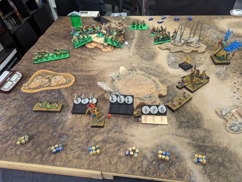 Eventually, I get the remaining Fallen and Kruufnir into the left Guard Horde, do a bunch of damage but double one’s it. Fortunately, I don’t suffer much for it, with the Fallen surviving and Kruufnir just wavered. It is removed next turn. Magnilde has kept chipping wounds on the other Ceremonial Guard Horde, and the remaining Phoenix has been a poor healer.