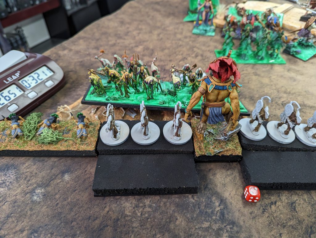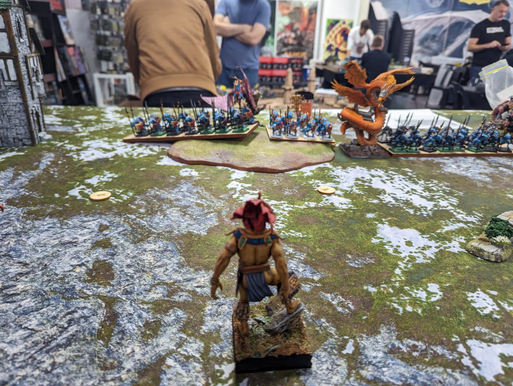 1 x Ancients Regiment 2 x Salamander Ceremonial Guard Horde 2 x Scorchwing Regiments 1 x Rhinosaur Cavalry Horde 1 x Ember Sprites Regiment 1 x Lekelidon 2 x Phoenix 1 x Herald - Lute of Insatiable Darkness 1 x Ghekkotah Skylord on Scorchwing - Trickster’s Wand 1 x Rakawas, The Pale RiderThis is a tough list. It's got big blocks of high defense infantry backed up by a lot of heal. A bit of shooting to keep you honest, a hefty bit of punch and it's fast too. Annoyingly, it's faster than me, and while the Scorchwing Regiments will struggle to kill most of my units in one go, they will hold them up long enough for the other unit to get into a flank, or to get the Rhinosaur Cavalry or Rakawas in charge range.