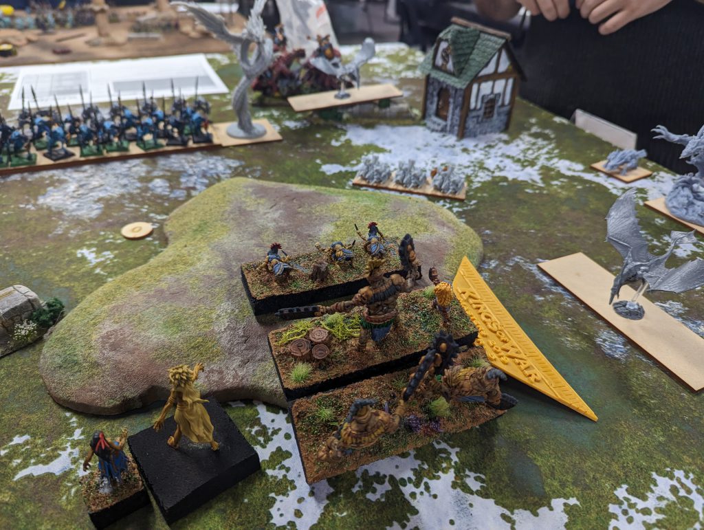 Definitely flanking Scorchwings!Magnilde and the Night Raiders are taking out the Scorchwings, and the Cavern Dweller gets a Phoenix. But the Cavern Dweller is killed in return, again holding up the Ceremonial Guard and Rhinosaur Cavalry.
