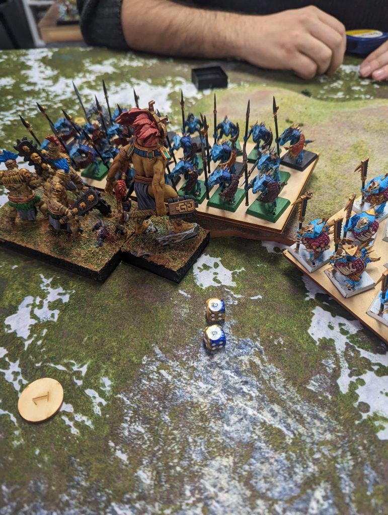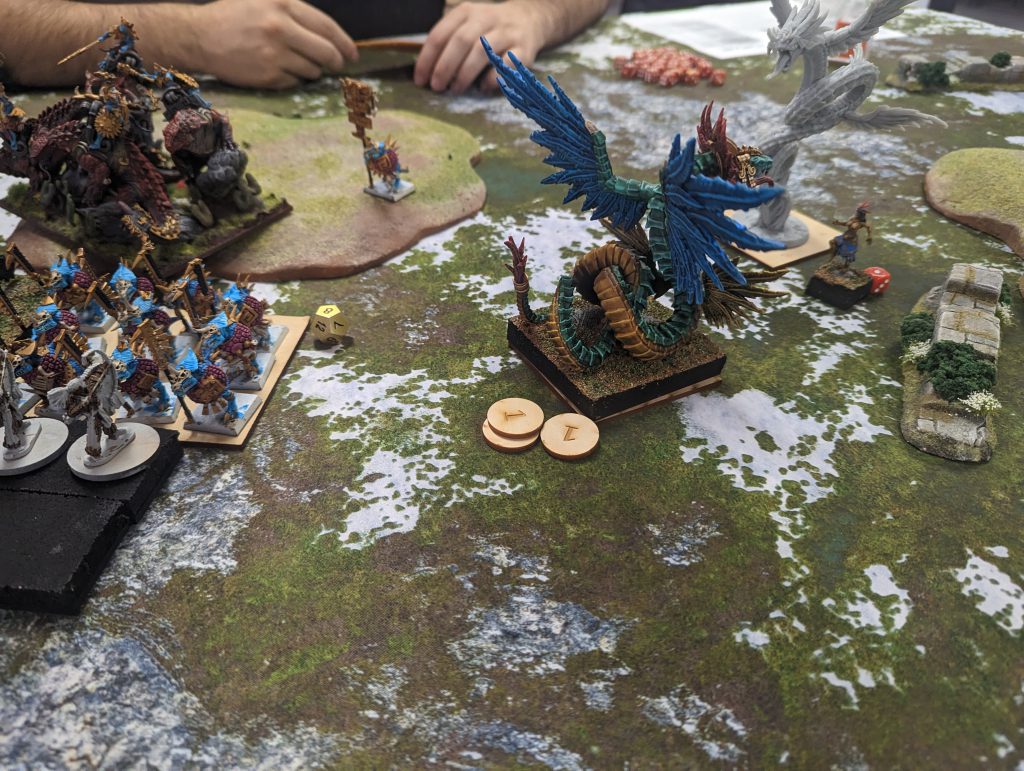 At this point my brain was struggling, a new army at a tournament was draining. My Dragon still lived, and I saw a path to reach the nearest, yet distant token. What I somehow managed to completely avoid seeing was that Dave’s Soul Reaver Infantry were clearly in range to charge, and he did so. Sorry Dragon.
