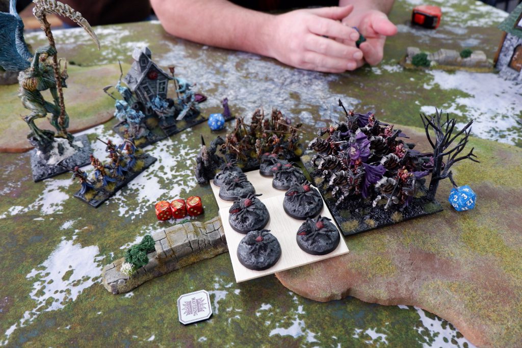 The Fiends (more spiders) were all that remained.In the end I won. The Fiends were on my side of the battlefield, but my Wights, Skeleton Spearmen, Vampire on Undead Dragon and Lykanis were on his.