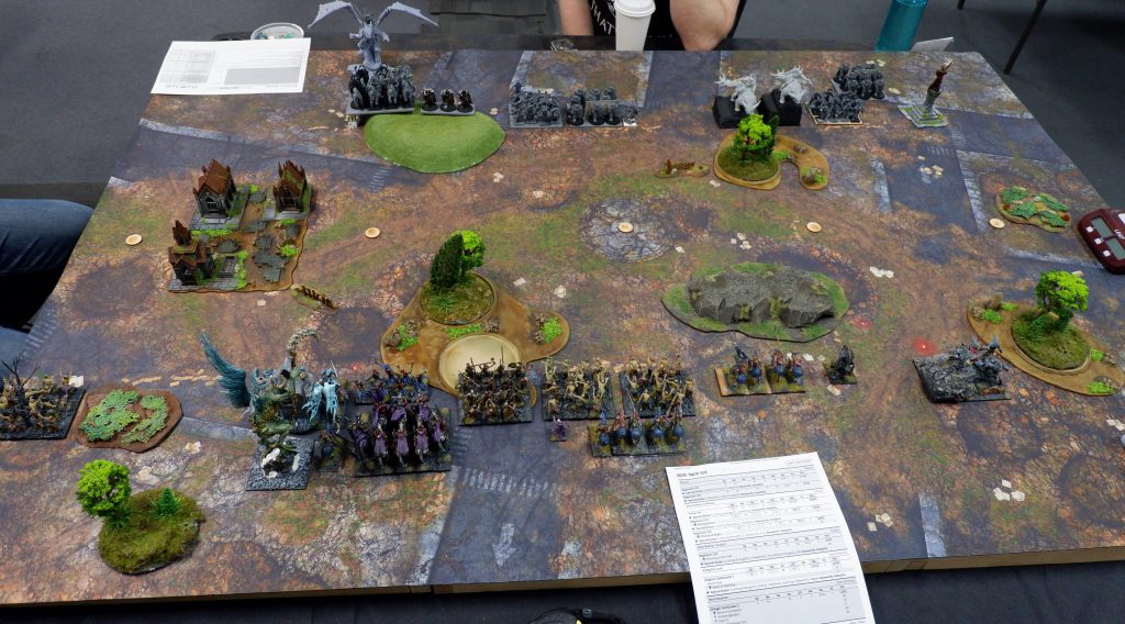 With a win and a loss, I was hoping to have a nice peaceful game to round out the event, so I matched another Undead player with another variant of army (seriously, Undead have so many builds!).2 x Revenant Regiments 1 x Revenant Horde - Hammer of Measured Force 1 x Soul Reaver Infantry Regiment 1 x Werewolves Horde - Helm of the Drunken Ram 1 x Wights Horde - Brew of Sharpness 1 x Revenant Cavalry Troop 2 x Balefire Catapults 1 x Vampire Lord - Blood Rage, Gnome-Glass Shield 1 x Revenant King - Lute of Insatiable Darkness 1 x Necromancer - Surge (6), Weakness (2), Inspiring Talisman 1 x Cursed Pharaoh - Wings of HoneymazeThe list is somewhat similar to my own, but taking everything a bit more elite where I took something cheap. I took Zombies, Dave took Revenants. I have a Vampire on Dragon, he has Sharpness Wights. I considered myself intimidated.