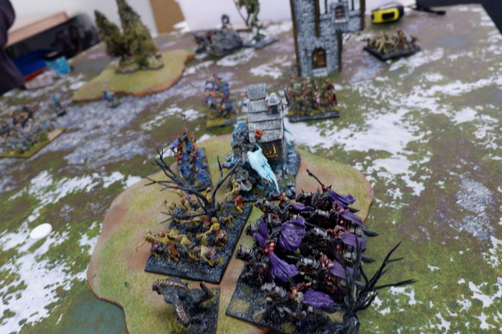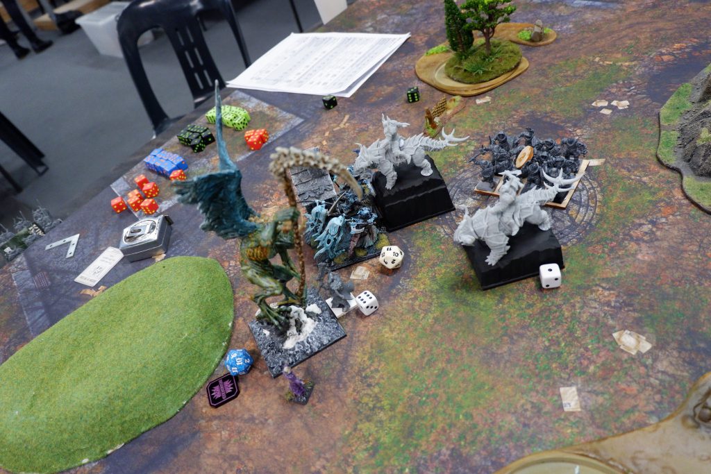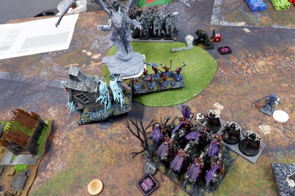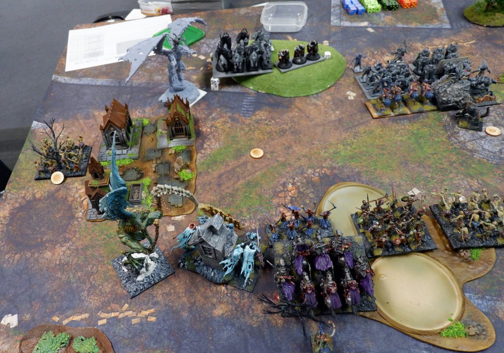 The other Fallen try to stop the next Wights, but can’t manage it, and are also taken off. On the other side of the board, the shooting from the Night Raiders is doing nothing, and the Cavern Dweller can’t roll enough attacks to kill the Wraiths. We do do some damage, killing the Soul Reavers after a lucky waver, and Chimera bounces around taking out some Revenant Cavalry before running off to claim an objective for me. In the end, it is one to three, to Andrew.
