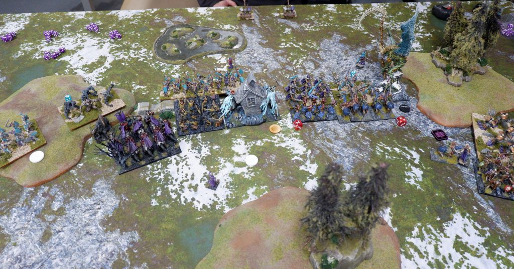 Plunder was the scenario this time around; five loot tokens along the centerline, with two worth two victory points rather than one. I picked the very middle, and my opponent the far right. This was my first mistake. It was a mistake because I then deployed in the middle, with my Wights and Soul Reaver Cavalry towards the left, keeping a massive piece of blocking terrain on my left flank. This meant I was already quite far away from that crucial middle two-point token, and completely out of reach of the far right token. Not smart.