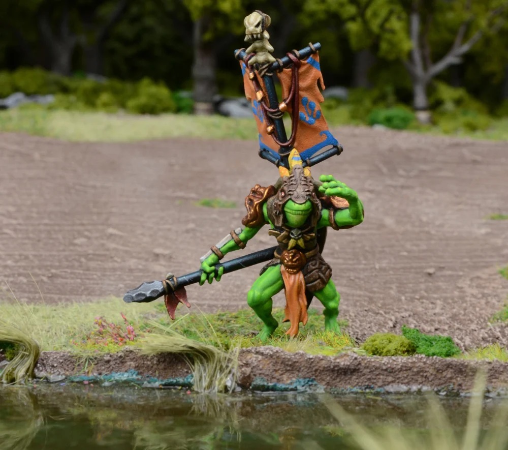 Riverguard Sentinels, long neglected, is coming back something vicious. Credit: Mantic GamesYet if there is one thing that can completely change the usefulness of a unit overnight, it is the Aura. It worked for the Army Standard Bearer units, so why not the Riverguard Sentinel. With Aura (Vicious - Amphibian only), this frog man brings the Amphibian units to a new level. Most obvious is the fact that Dambusters with Vicious will effectively have complete conversion of their successful Hit rolls to Damage rolls - rerolling 1s when damaging on 2+ is just a fantastic feeling. The Dambusters are suddenly capable of removing a unit on the charge quite easily, especially if they have Brew of Sharpness for Melee 3+.