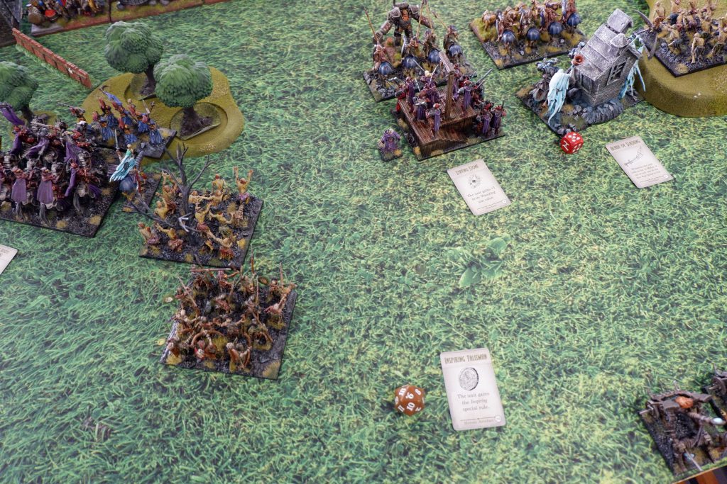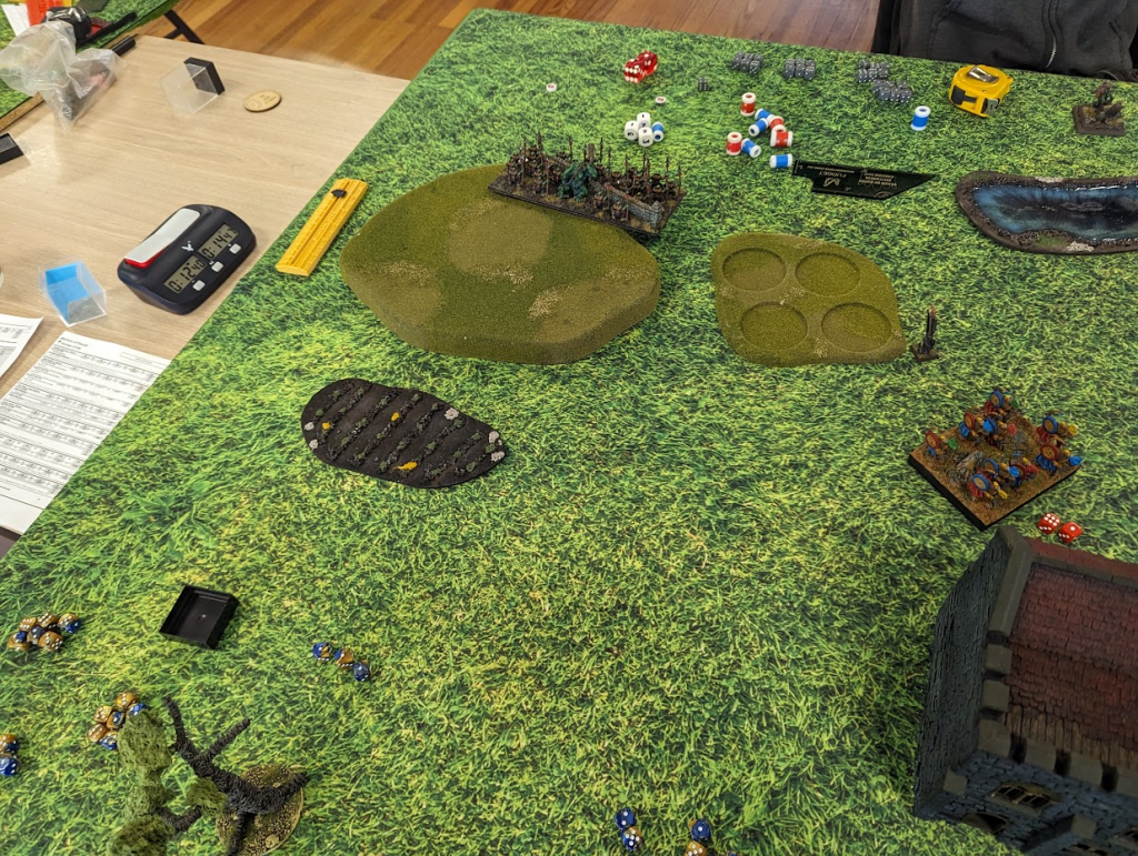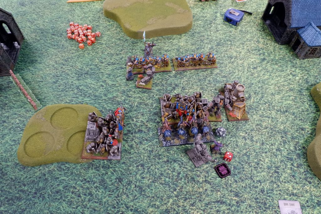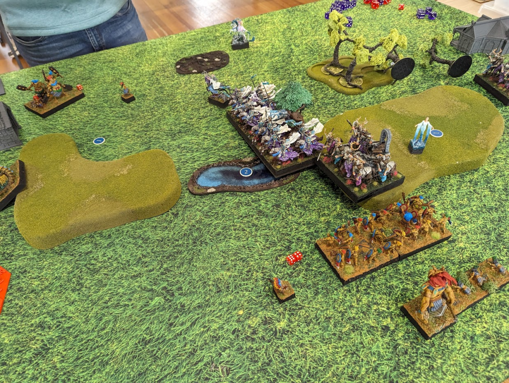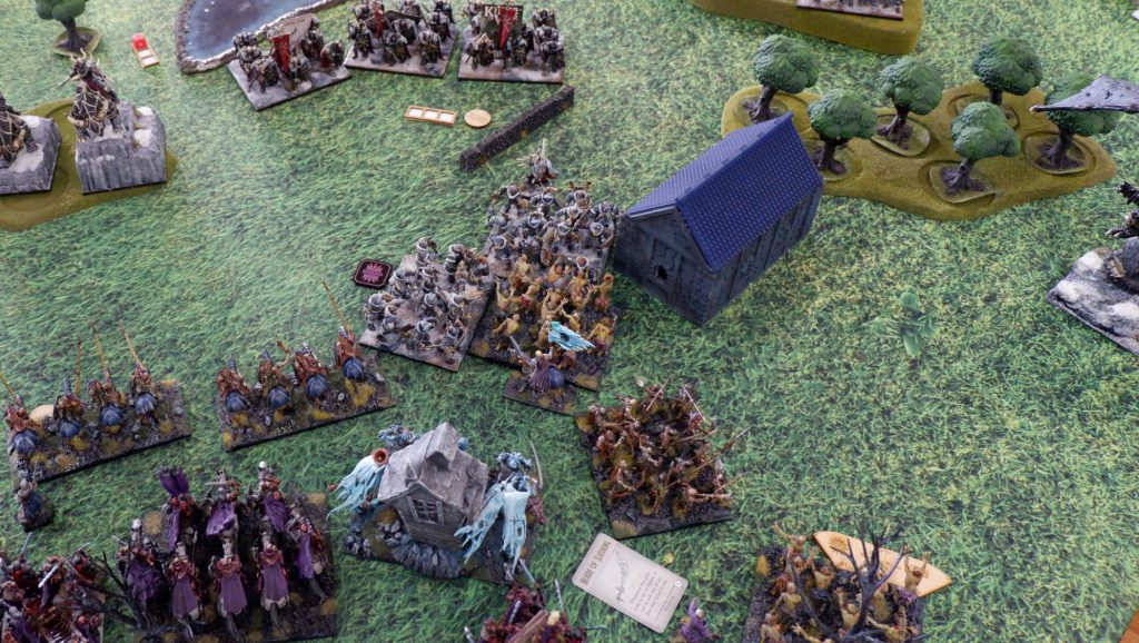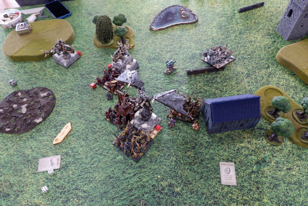 I am feeling pretty good at this point. A whole bunch of units can grab the left flank token easily now, and while there’s a horde of goblins on the center token, shooting has been chipping it down all game, and Goblins aren’t known for their high nerve.