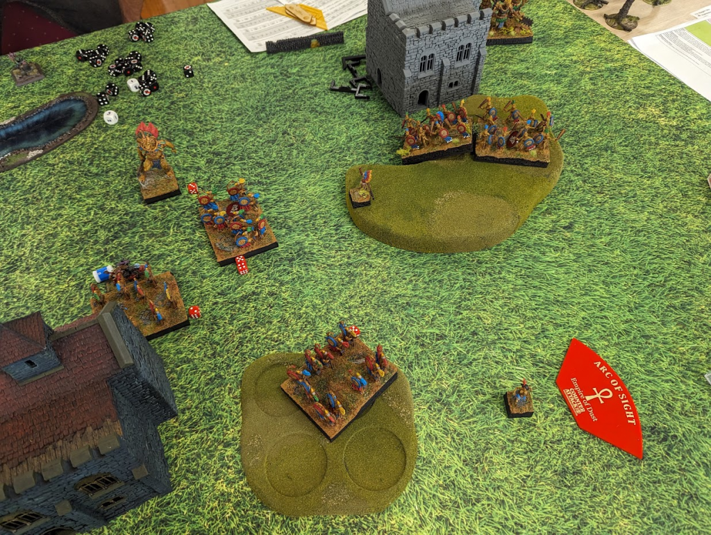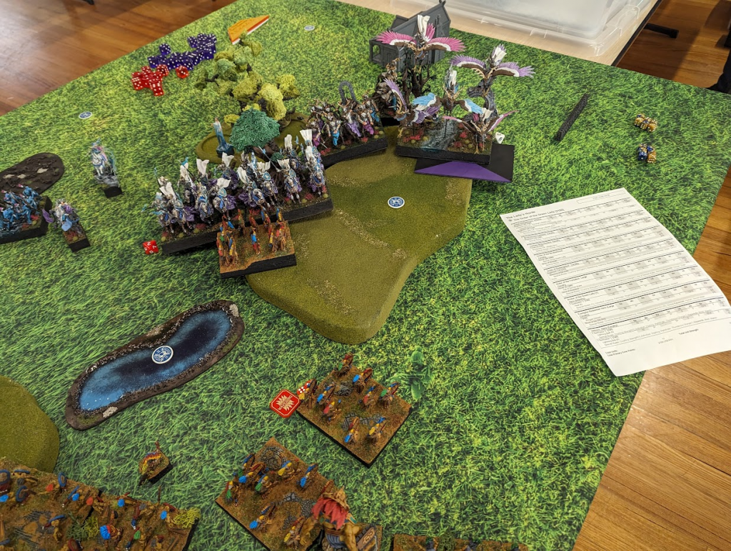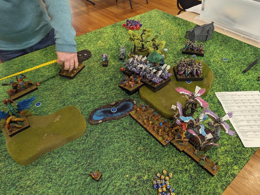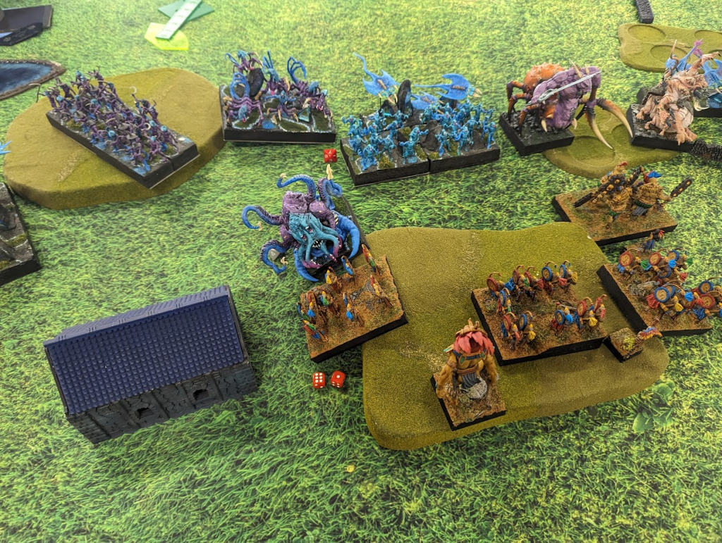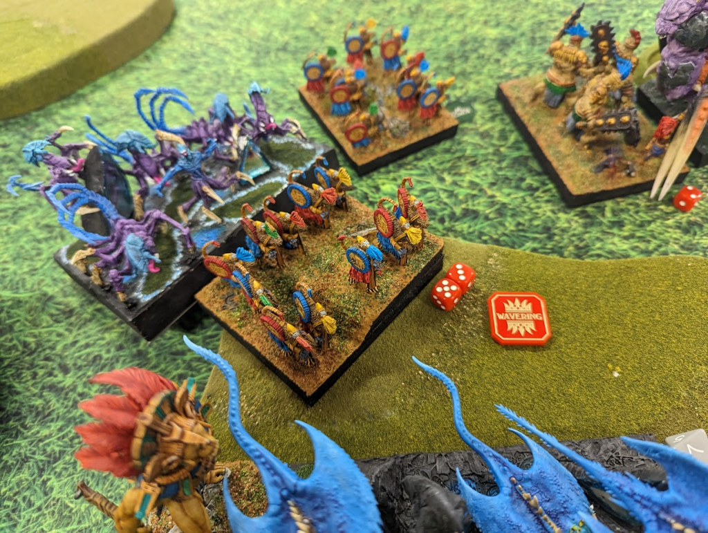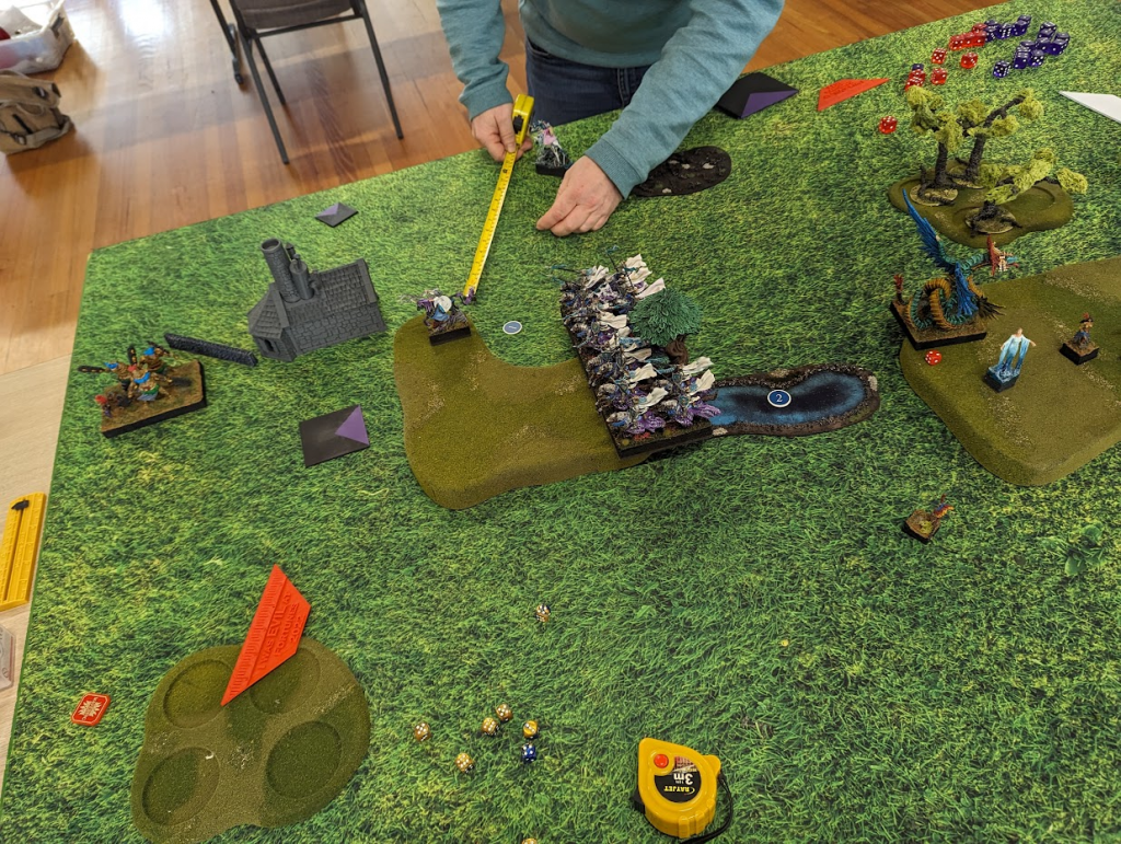 I am feeling pretty good at this point. A whole bunch of units can grab the left flank token easily now, and while there’s a horde of goblins on the center token, shooting has been chipping it down all game, and Goblins aren’t known for their high nerve.