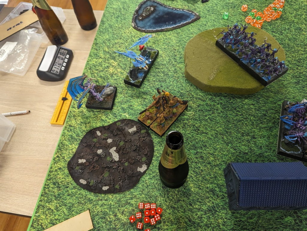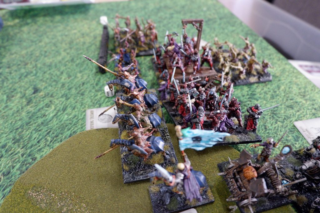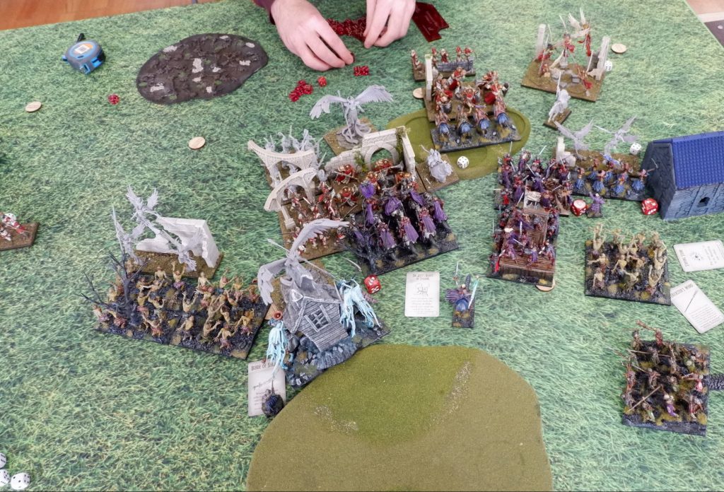 The Wyrms are going down and the chase for the middle token begins! Go Skeletons!But it all didn’t matter, the Ghouls had grabbed the token in the middle, and were trying their best to get away! So the Skeleton Spearmen moved up in Turn 6, and I poured in all my Surge from the two Revenant Kings in Turn 7, and managed to rear charge the Ghouls and wrench the token for a victory. Surge shenanigans winning the game, but it was such an enjoyable and intense game from Scott.