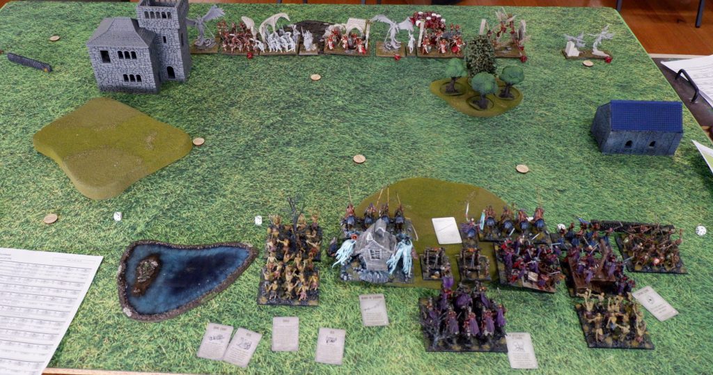 The demise of the Soul Reaver Cavalry left the Ogre Palace Guard completely exposed to the Wights. The Phoenix failed to disorder them, so the Wights went into the flank of the Ogres (with a withdraw) and the Wraiths finally brought down the Elohi regiment. The Men-at-arms Spearmen attempted to punish the Wights, but with their failure went down to a combined Wight and Soul Reaver Infantry attack. The Elohi horde went into the Wraiths, but also failed against the Defense 6+. These angelic beings were brought low by the other Soul Reaver Infantry. At this point the final regiment of Elohi fell to the Zombies, as did the Phoenix to the Skeleton Spearmen.