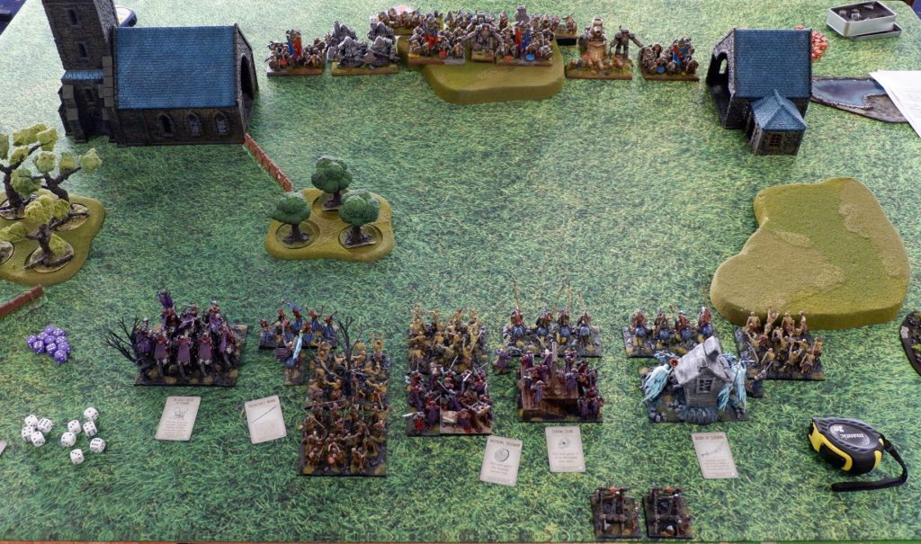 3 x Zombies (regiment) 1 x Skeleton Spearmen (regiment) 1 x Wraiths (troop) 2 x Soul Reaver Infantry (regiment) one with Staying Stone 1 x Wights (horde) with Blade of Slashing 2 x Revenant Cavalry (troop) 1 x Soul Reaver Cavalry (regiment) with Sir Jesse’s Boots of Striding 2 x Balefire Catapults 1 x Revenant King with Surge (5) 1 x Revenant King on Undead Horse, with Trickster’s Wand (Hex 2), Surge (5) 1 x Necromancer with Inspiring Talisman, Heal (3), Bane Chant (2)