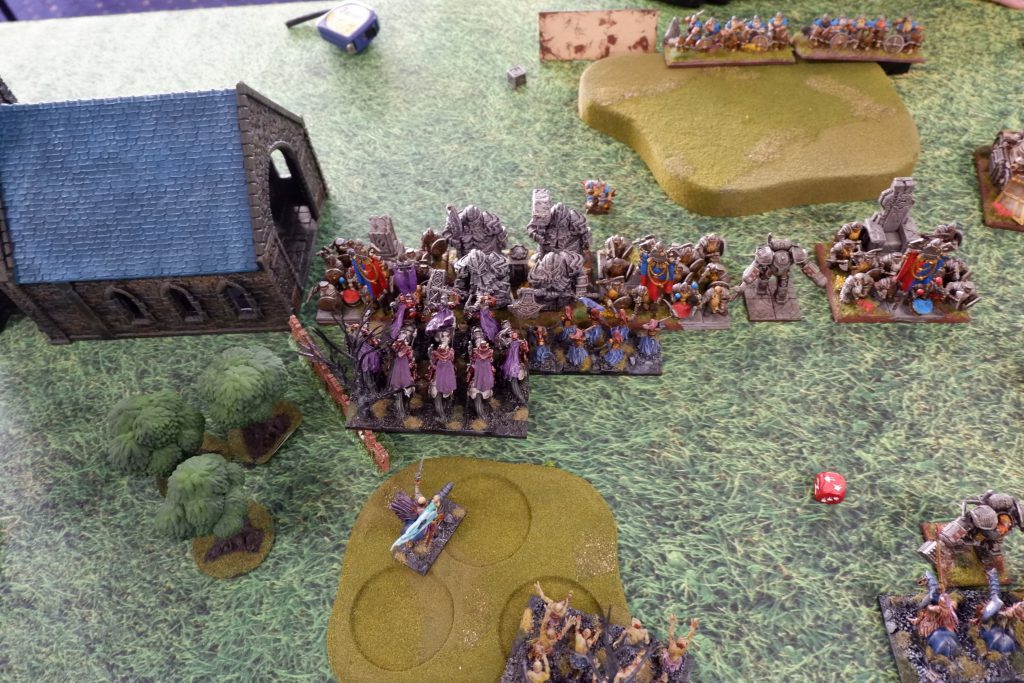 The unflankable Dwarfs arrayed on the hill.After my intense game with Scott, I couldn’t think of a good plan for this match. The two pieces of blocking terrain and the surrounding difficult terrain made it difficult to think of a plan to flank the Dwarfs. Unfortunately, flanking Dwarfs was exactly what I needed to be doing. I arrayed my entire army in the centre, and grimly prepared to press on.