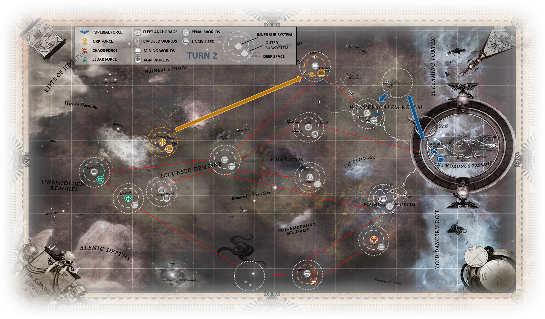 Turn Order: Orks, Imperial, Chaos, EldarFollowing our intro 2v2, the first campaign turn saw us run through the campaign rules to get a feel for the campaign action mechanics. We agreed to reserve 40k Crusade roster building for a later date as the fleet dynamics were the only thing likely to be initiated on the first day. While the Ork and Imperial factions opted to settle their home subsector's outlying systems, the Chaos and Eldar factions pushed outwards, skipping the uncivilized worlds for the more valuable worlds in neighboring subsectors.