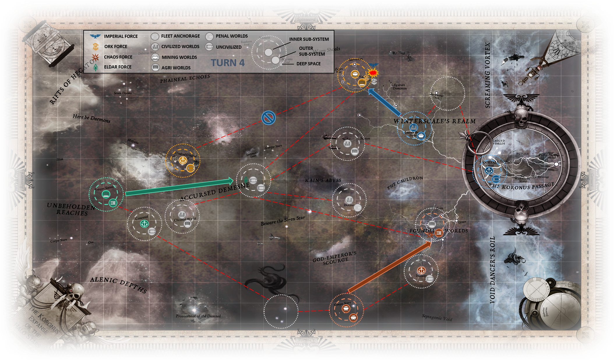 Turn Order: Eldar, Chaos, Imperial, OrksTurn four closed out by seeing the first fleet engagement of the campaign. The Imperial fleet, dispatched to investigate the lack communication from multiple worlds in the subsector containing the Valcetti's Salvation system, discovered substance to the rumors of a mounting Ork Waaagh. Following the events at Salvation's Gate the Ork fleet was pushed deeper into the subsector to regroup while the Imperial fleet held their patrol line in the outer reaches. The Eldar and Chaos factions continued their nefarious plans and expanded to a second subsystem - the Eldar moving interior to the isolated and unpopulated worlds of the Accursed Demesne for reasons beyond our measure. Meanwhile, the maligned forces of Chaos appear to be solidifying their holdings within the Foundling Worlds and are positioned to come into conflict with the Eldar.