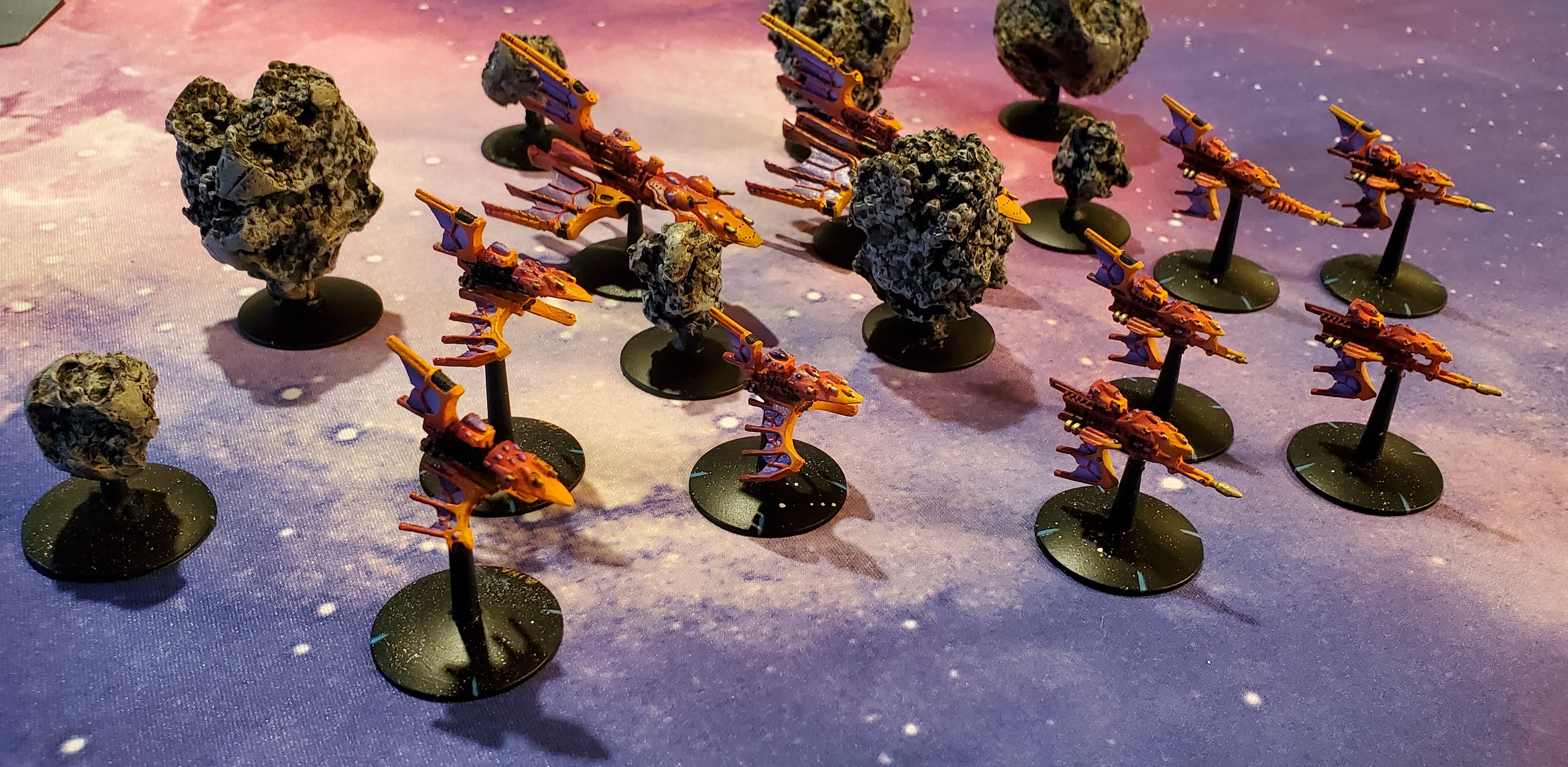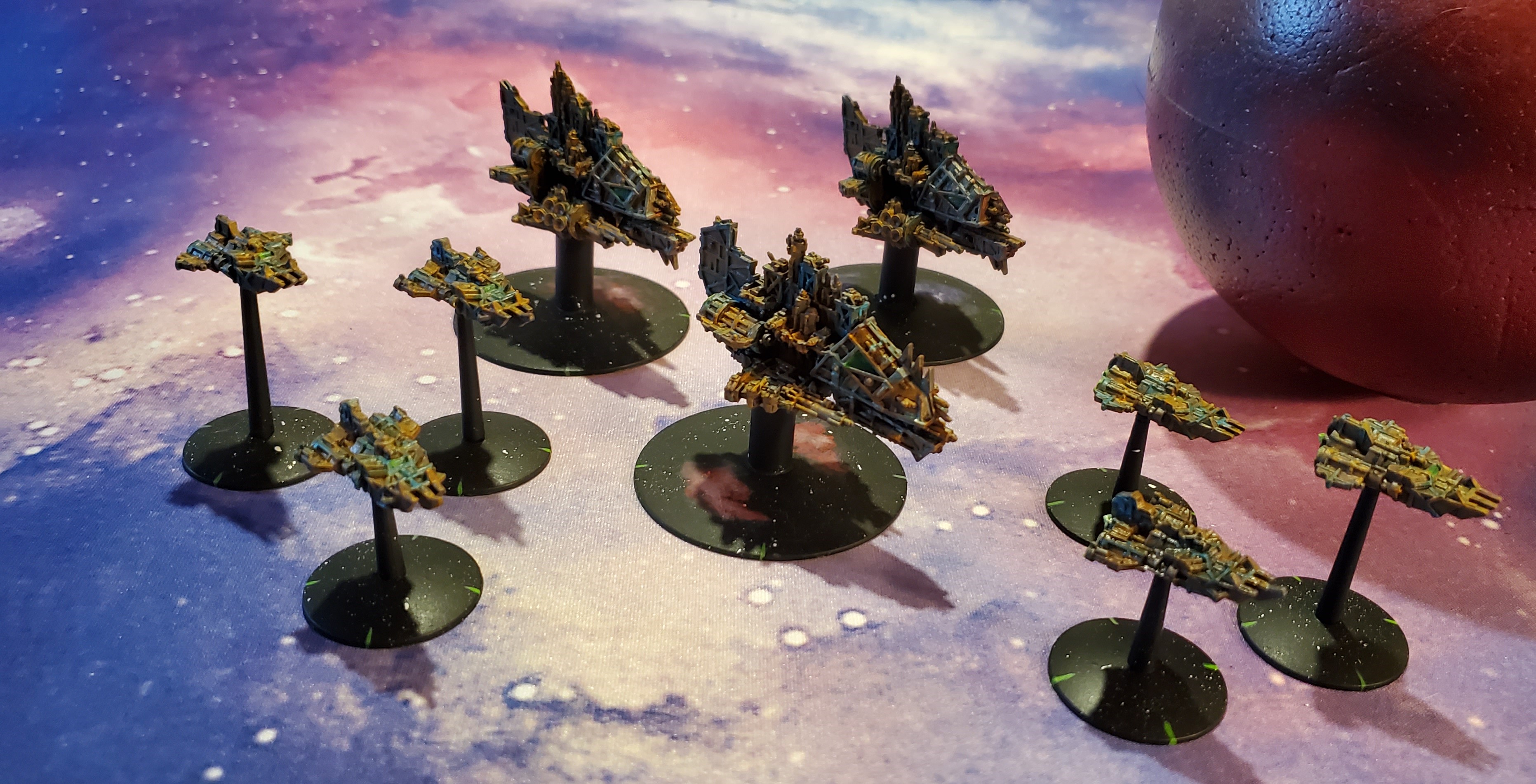 - Orks: 50 Points - Purchased 3x Brute Ram Ships (Mork's Teeth) and Mega Armored Orks on Ol Thunda (Kill Kroozer, flagship) - 10 Points Remaining