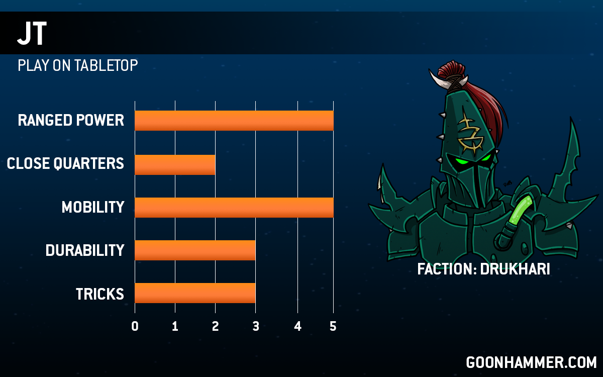 A rabid Dark Eldar (not Drukhari!) player, and general fan of the perfidious Eldar, JT has waged wars across the webways at the head of all manners of raiding forces. From Corsairs to Exodites, he's played and owns them all, and loves nothing more than to marshal those classic models to victory.