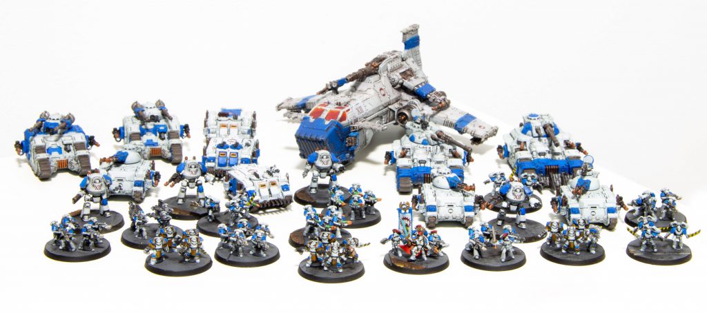 Colin's Solar AuxiliaI absolutely love this army. It will be my main army for Legions Imperialis for the foreseeable future. I enjoy the diversity of the vehicles available as well as the visual impact of the massed infantry at this scale. That's what Legions Imperialis is all about for me! My infantry scheme has gold armor, dark sea blue fatigues and white pads, with black guns and steel backpack/weapon detailing. Tanks are white with gold trim, black guns and steel detailing. I wanted to keep a limited palette at this scale to make it efficient but also have a strong visual impact on the table.