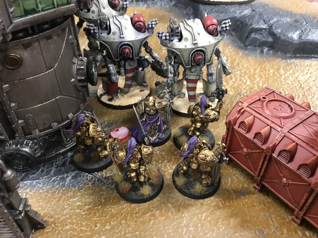 Post lunch, and having had another can of Irn Bru (bringing me up to five since Friday morning), it was down to the Conduit to fight Drew’s mechanicus over a crashed thunderhawk. Drew is another artist in the medium of miniatures, and the mechanicus army is stellar, well thought through and beautifully realised from concept to execution. This was a close game right up until events in the campaign made everyone on the board have +1 to wound rolls and -1 to saves.For Mechanicum firing S8 beams and shit into marines it didn’t do much to affect the maths - if he hit, he was nearly always killing on a 2 anyway, but for me trying to kill T6 and T7? Game changer. When we turned that card over, it turned into a bit of a blender.